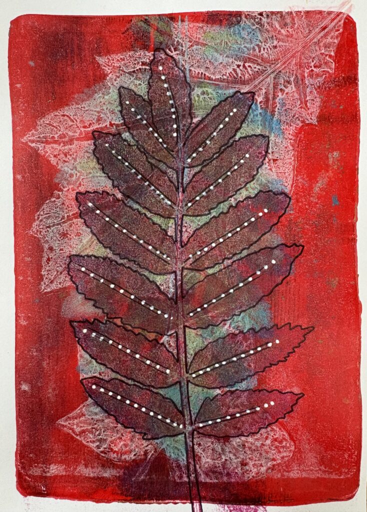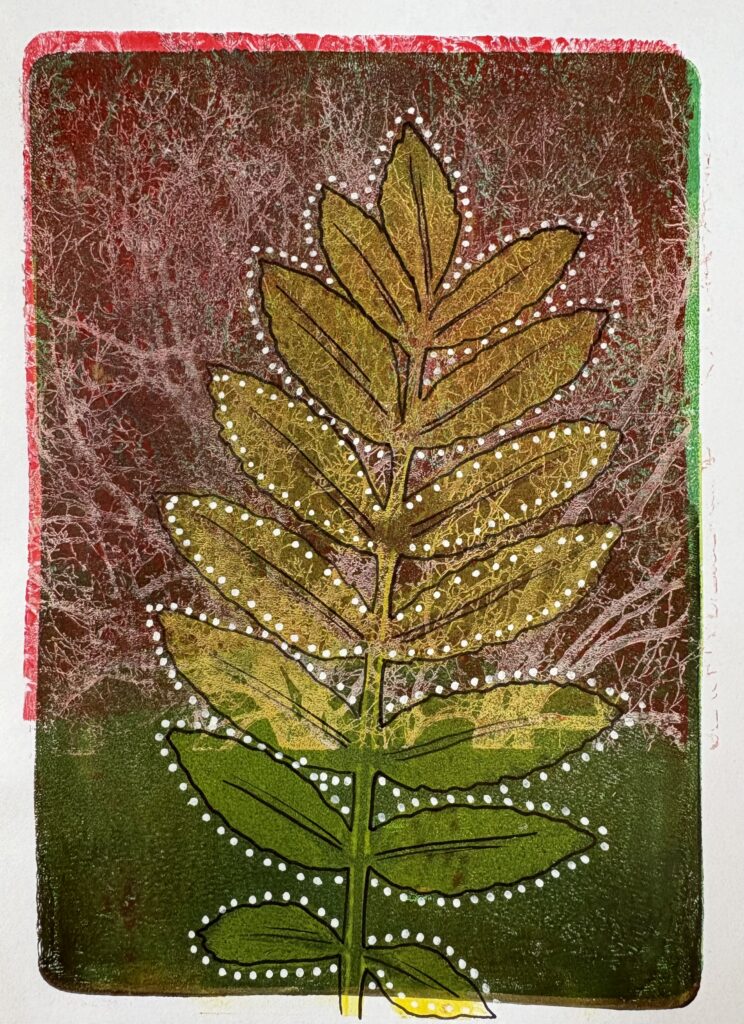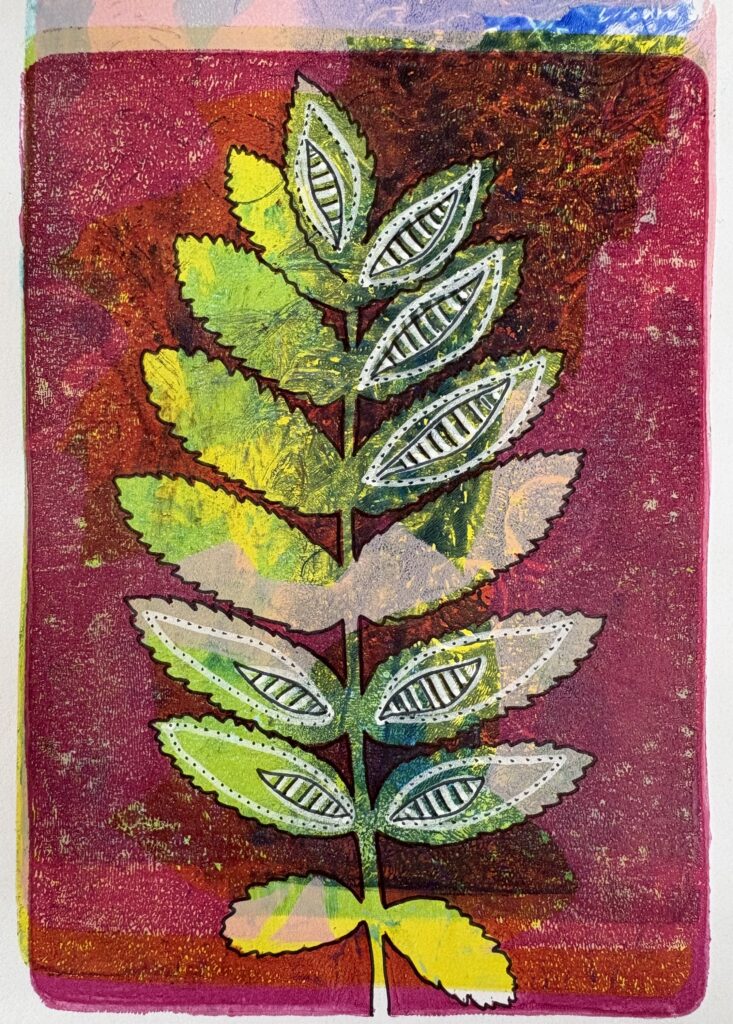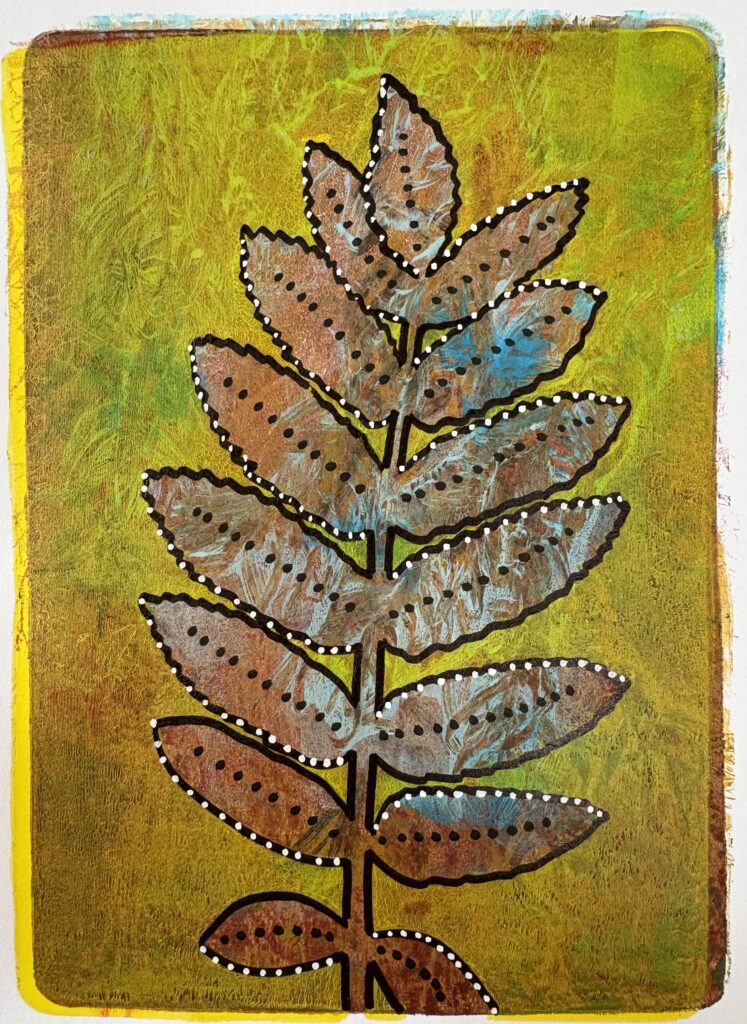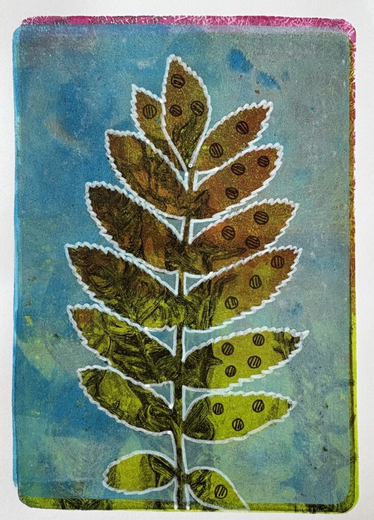 Hieronder zie je een aantal van mijn gelprints ter inspiratie. Gelprinten is een mooie techniek om monoprints mee te maken. Je gebruikt een speciale gelplate waar je met een roller acrylverf op aanbrengt. Met sjablonen, stencils, stempels of gewoon met materiaal dat je in en om je huis hebt liggen (karton, bladeren van een boom, stof, een spateltje enz.) breng je structuur aan in de verf. Na het drogen van een laag kun je een nieuwe laag eroverheen aanbrengen. Je kunt dus gelaagd werken of meteen een print maken. De mogelijkheden zijn eindeloos en je maakt steeds weer uniek werk 🙂