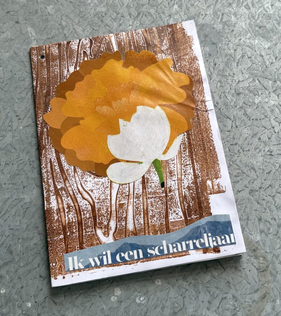 In deze workshop maak je een Zine (gevouwen boekje). Je start met het eenvoudig bedrukken van je papier met de Gelprint-techniek. Daarnaast scheur je afbeeldingen en/of tekst uit tijdschriften en als je dat wil schrijf of teken je zelf nog iets dat je aan het verzamelde materiaal toevoegt. Vervolgens maak je er een collage van op je ‘bedrukte’ papier. Door het vouwen van het papier ontstaat een klein boekje waar je verder nog details in kan aanbrengen met bijvoorbeeld fineliners of markers.