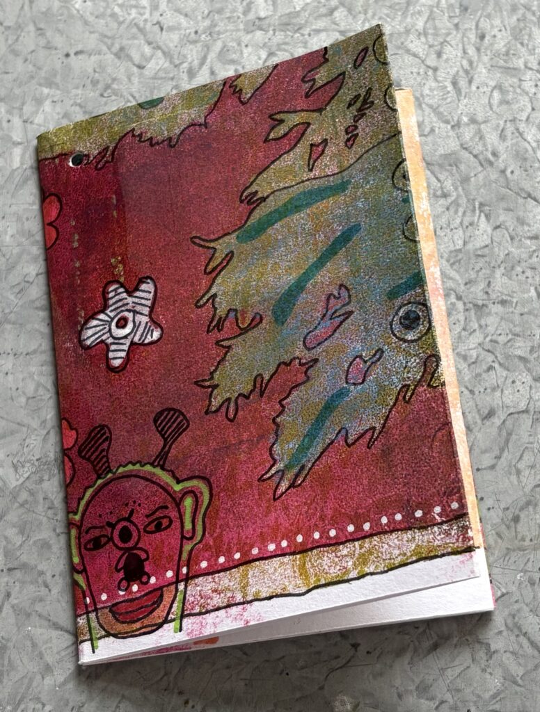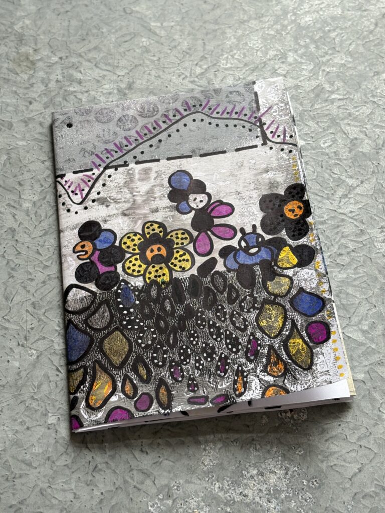 Mijn Zines hebben altijd een Gelprint ondergrond als basis. Daarna gebruik ik verschillende materialen zoals: markers, Posca acrylstiften, potlood, verf, collage, tekst.